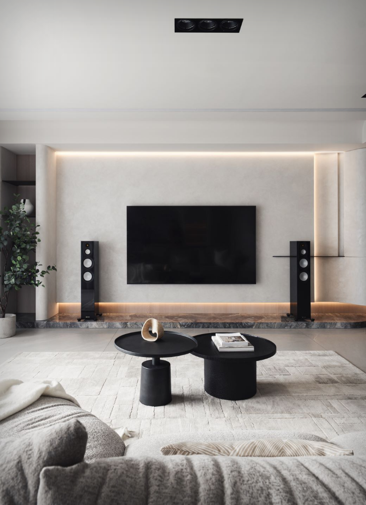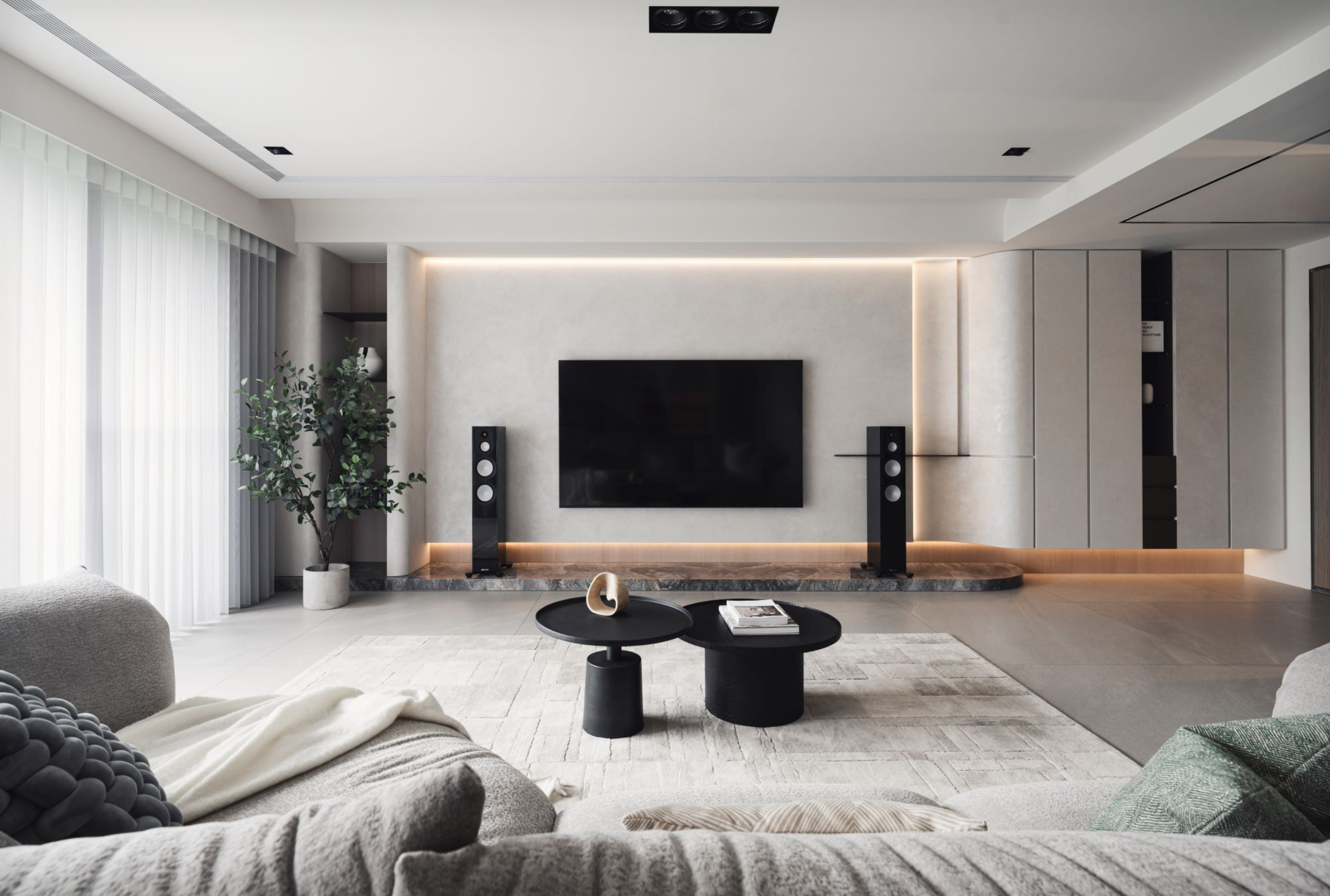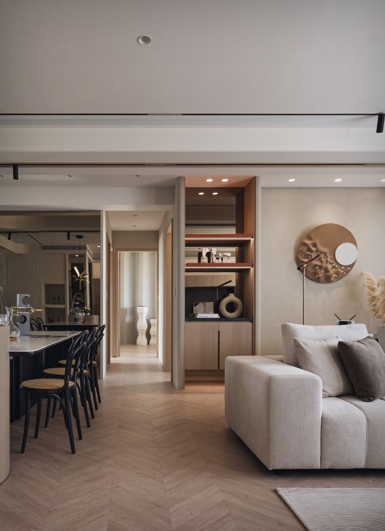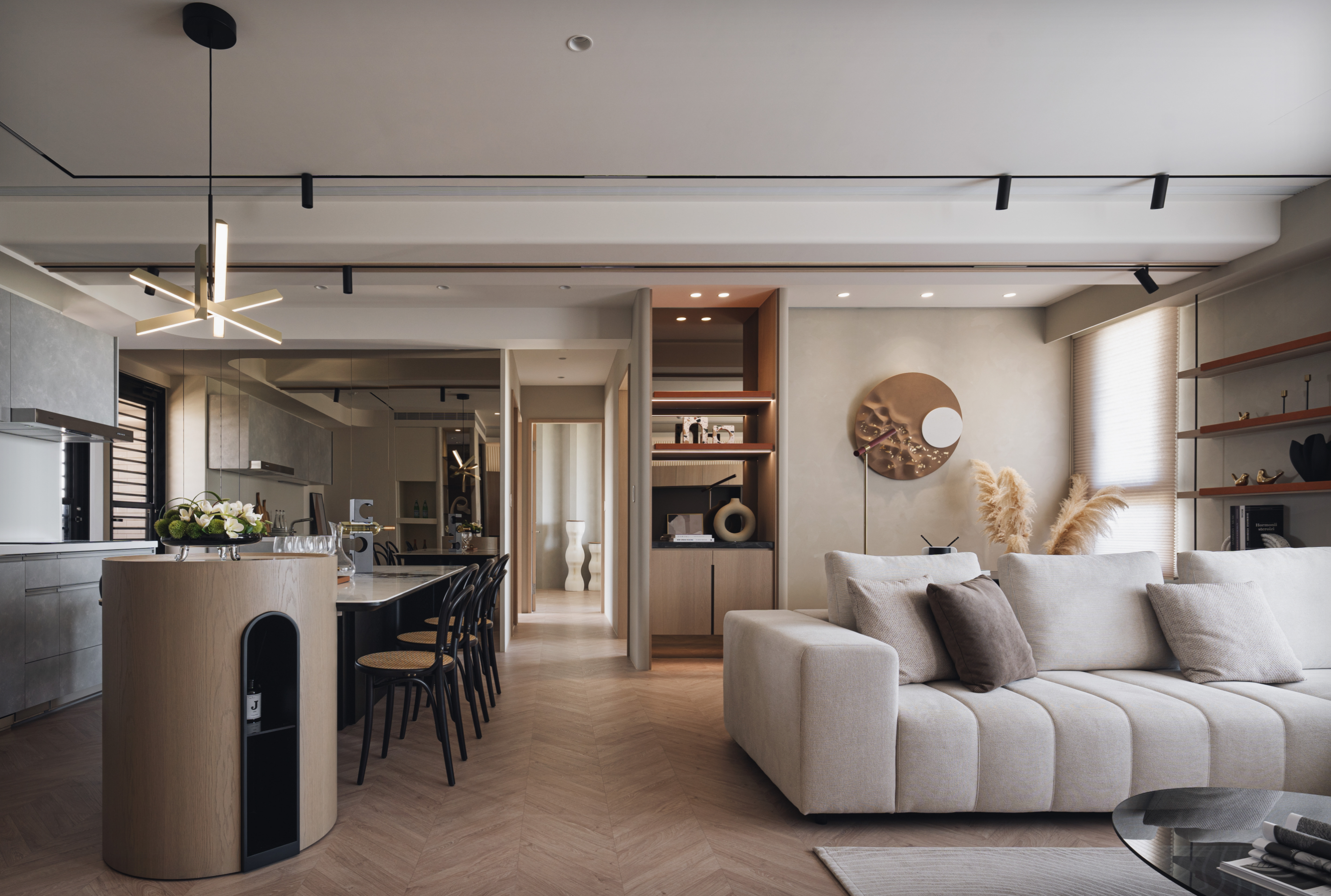 With the space conditions of large square meters, we use the advantage of wide area to use color, material and design in various spatial fields. The exquisite craftsmanship embodies the low-key luxury and Wabi-sabi style residence, creating a grand and elegant style for the owner. A stylish and tasteful home. According to the owner’s life experience, the public area space is planned into three major areas: living room, kitchen and dining room, retaining large scale The advantage of being completely wide is that there are no partitions. The kitchen adopts a fully open design, divided into cooking area, island area, and electrical appliances. The preparation area, dining and wine cabinet, and island bar are decorated with marble countertops that exude luxurious temperament, combined with dark wooden slopes. The avant-garde Tom Dixon lava chandelier hangs from the ceiling, bringing together luxury and modern elements. Create a rich sense of layering. In the public space, the material expression changes and the design is full of artistic feel. The building material mineral paint is extended on the main wall of the living room, and the arc surface design is cleverly decorated on different facades and The ceiling beams, smooth and soft composition, outline the overall space through the reflection of natural light and shadow and light strips The comfort and elegance, the texture and texture bring a sense of nature and simplicity to wabi-sabi. The low-luxury space style uses a neutral tone of apricot gray and introduces color into the high-end soft furnishings and accessories. Luxurious elegance and quality of life are evident everywhere.